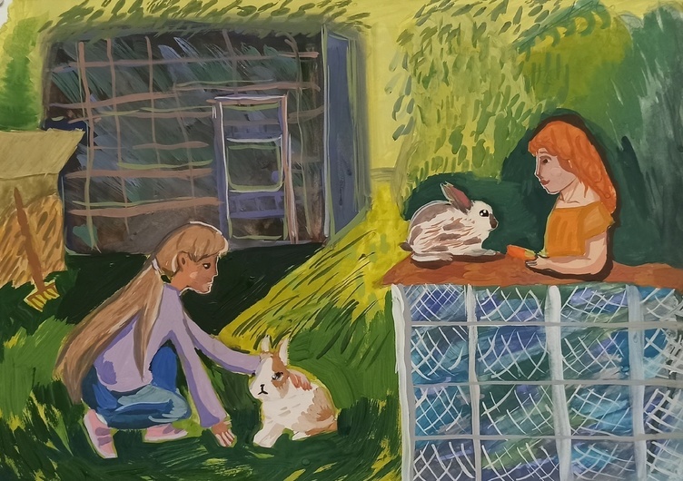 На рисунке Полина с сестрой на эко-ферме гладят кроликов.